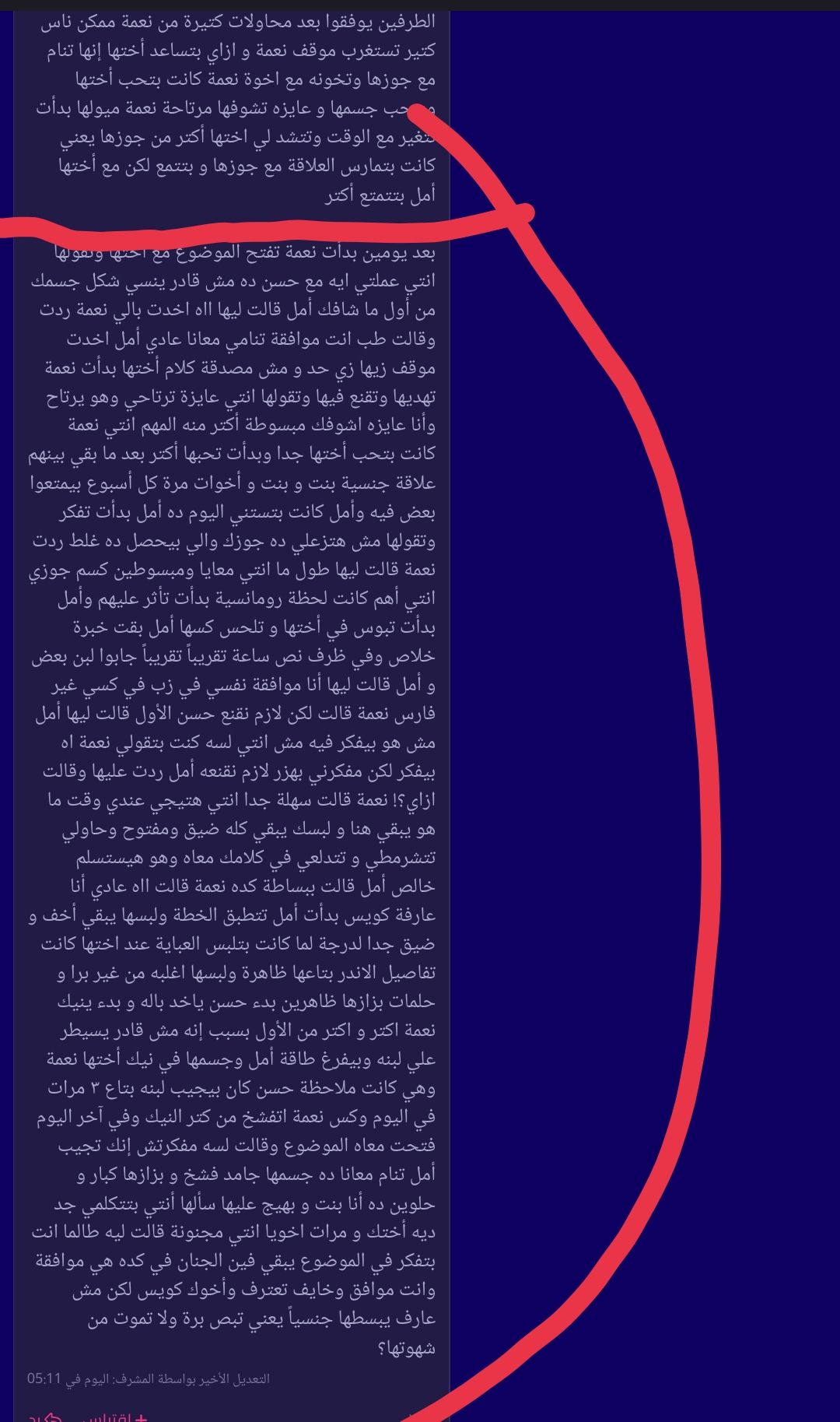 (نعمة) ردت عليها مش انتي قلتي عايزه تتمتعي وتفهمي اتفرجي علينا واعملي كده مع جوزك وبعدين انا أختك احنا ستر وغطا علي بعض أنا عاوزه تكوني مبسوطة انا هسيب الباب مفتوح شوية بالليل وانتي ابقي اتفرجي علينا من غير ما هو يحس